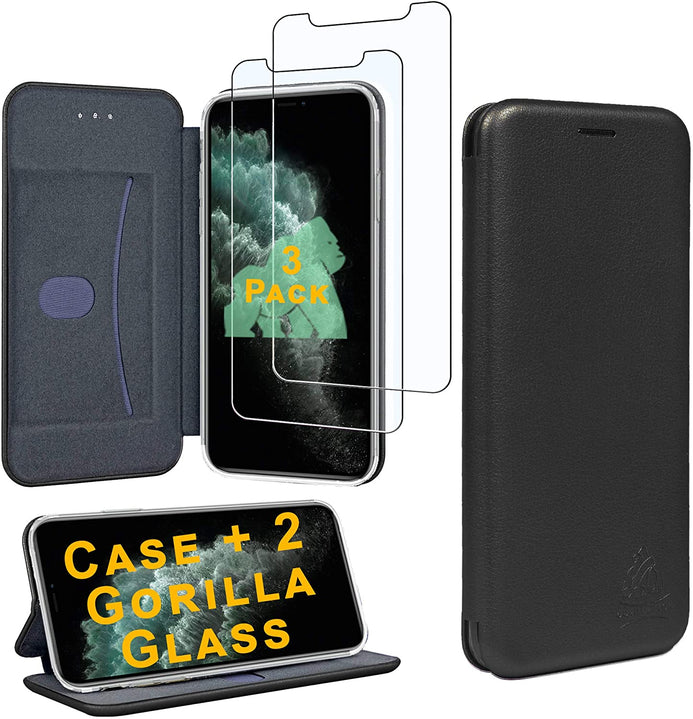 Gorilla Tech iPhone 11 Flip Case and 2 Screen Protector Tempered Glass 3D Curve Premium Designer Slim [RFID Blocking Card Slot] Magnetic Closer Wallet Stand Cover 3-Pack, iPhone 6.1"