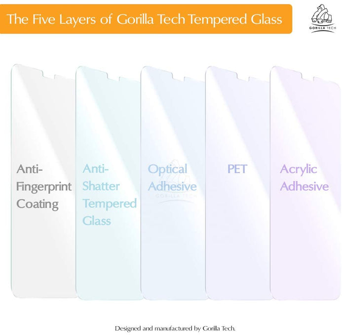 • These Quality Gorilla Tech PREMIUM TEMPERED GLASS screen protectors are super tough, ultra clear and maintain your screen's original touchscreen sensitivity without compromising the high-definition viewing experience.