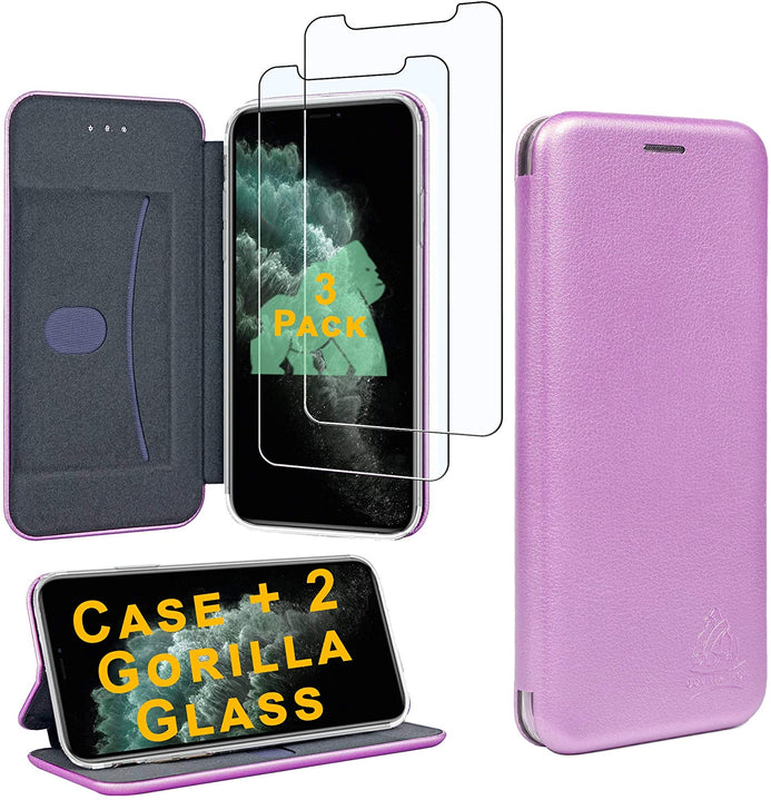 Gorilla Tech iPhone 11 Flip Case and 2 Screen Protector Tempered Glass 3D Curve Premium Designer Slim [RFID Blocking Card Slot] Magnetic Closer Wallet Stand Cover 3-Pack, iPhone 6.1"