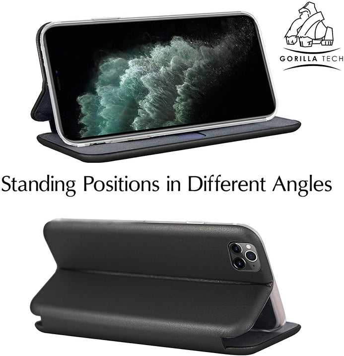 Gorilla Tech UK iPhone XS Max 6.5" PU Leather Case and Screen Protector Tempered Glass Wallet ID Card Holder Magnetic Closure Stand Curved Slim Flip Cover Black