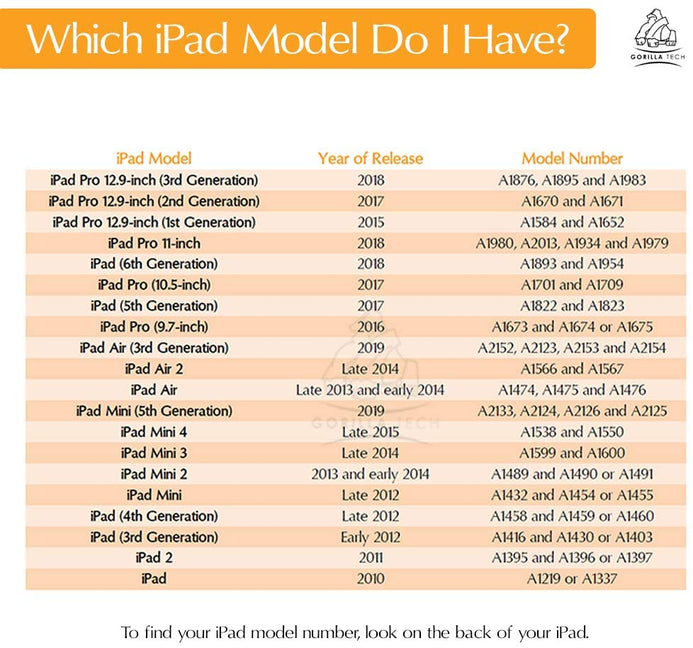 Gorilla Tech presents its Twin Pack Premium Glass Screen Protector for Apple iPad 7 Generation 10.2 inch (2019) iPad Air 3 10.5 inch and iPad Pro 10.5 inch Model Number A2197, A2200. A2198, A2152, A2123, A2153, A2154, A1701 and A1709. To identify your iPad Model, look for the model number on the back of the iPad near the bottom (the model number starts with “A” followed by 4 digits). that protects your iPad screen from knocks and scratches.